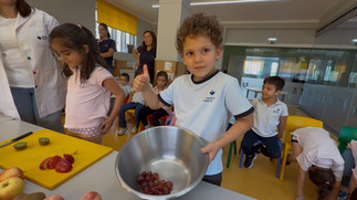 De regresso ao colégio, juntaram-se à Sala das “Abelhas” para lavar, descascar, cortar e preparar a salada de frutas, provando e partilhando a doçura natural dos alimentos frescos. Em idade pré-escolar, estas experiências são fundamentais para o desenvolvimento da coordenação motora, da autonomia e da capacidade de partilha e colaboração, ao mesmo tempo que consolidam hábitos alimentares saudáveis de forma prática e divertida.