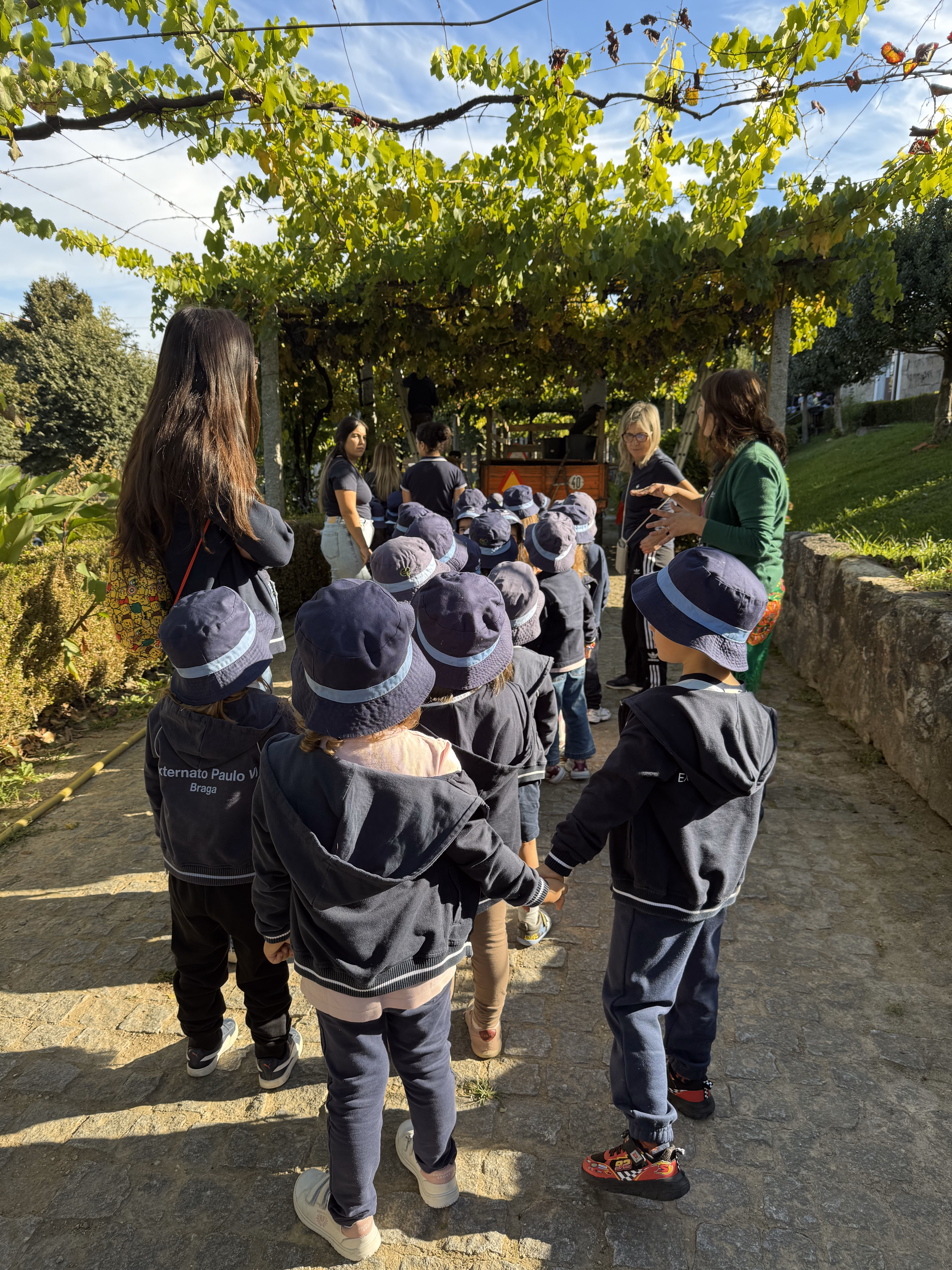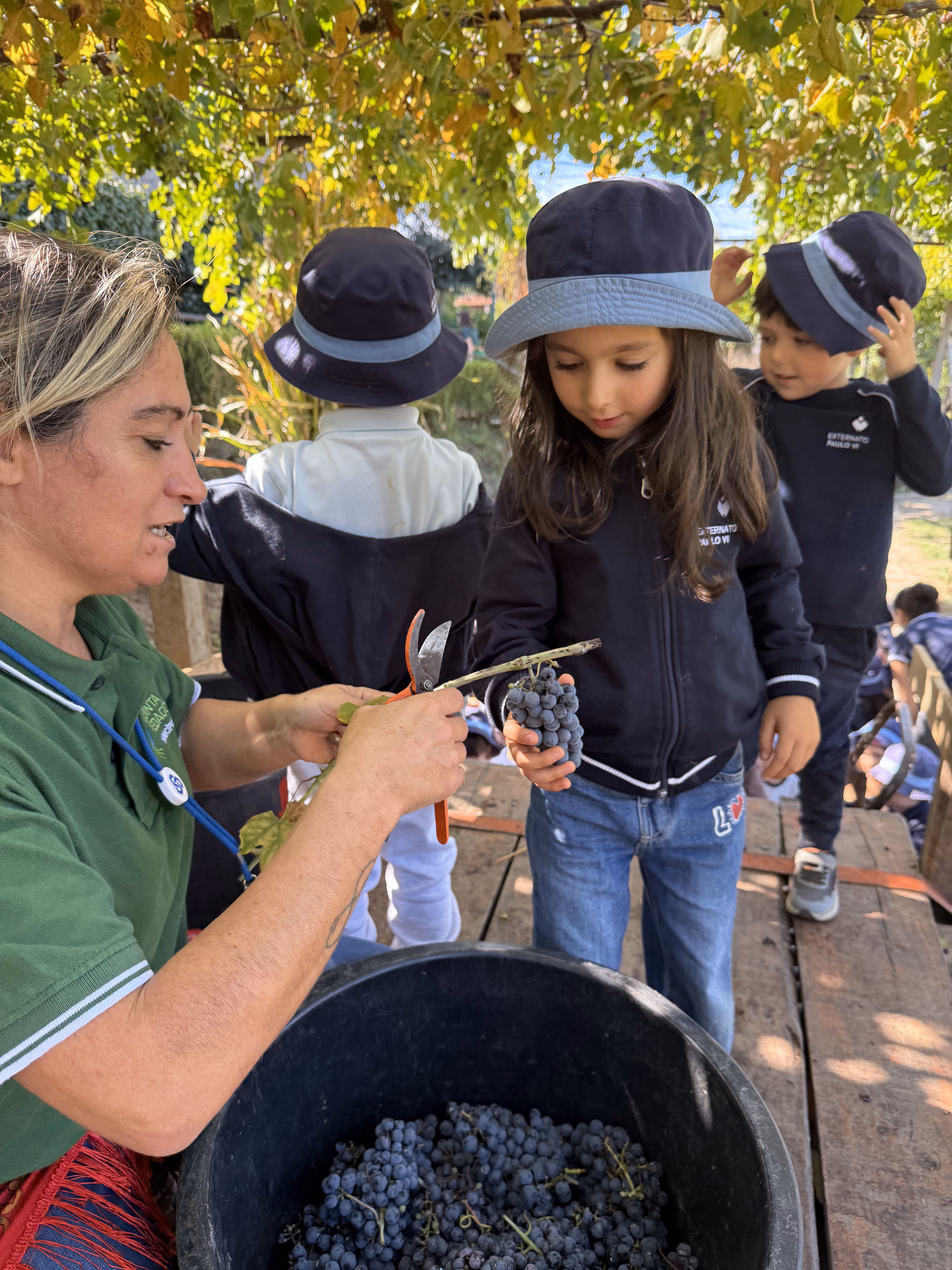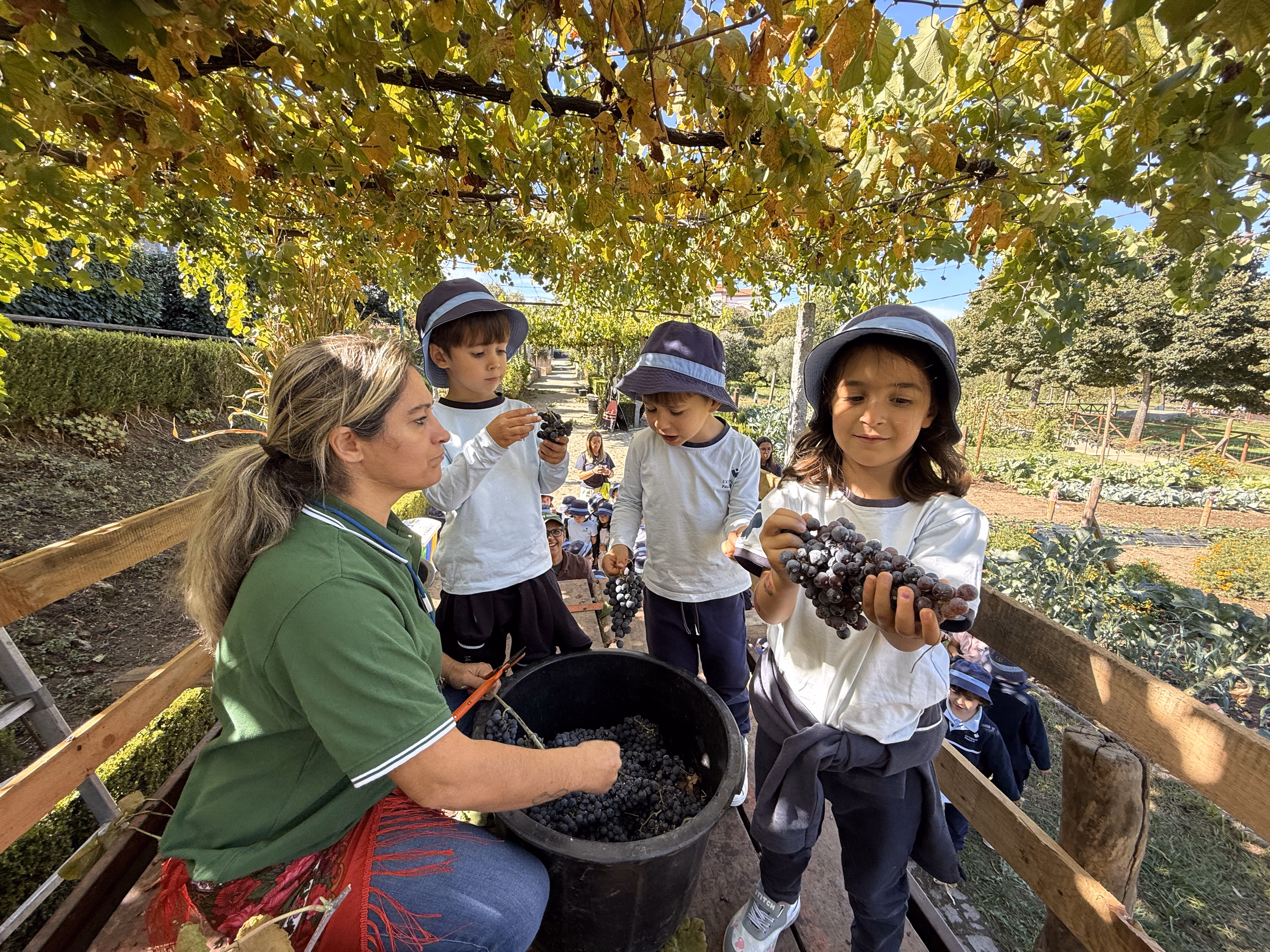 As crianças participaram também na vindima, atividade que marca a colheita das uvas no Minho. Descobriram como, em tempos, familiares e amigos se juntavam para colher os cachos, transportar as uvas em baldes e pisá-las no lagar, processo que dá início à fermentação e transformação em vinho. Esta prática era sempre acompanhada de entreajuda, celebração e convívio intergeracional.