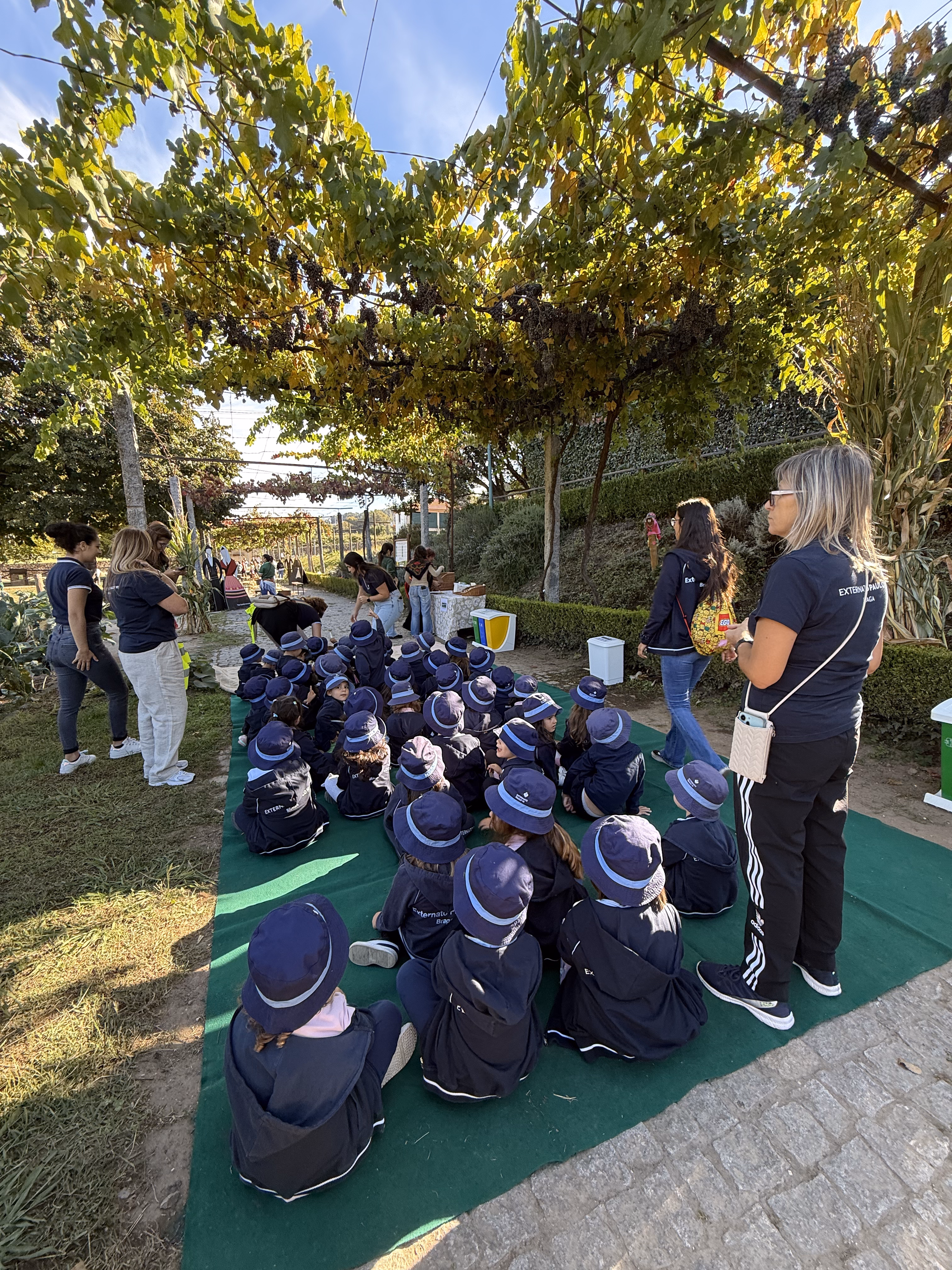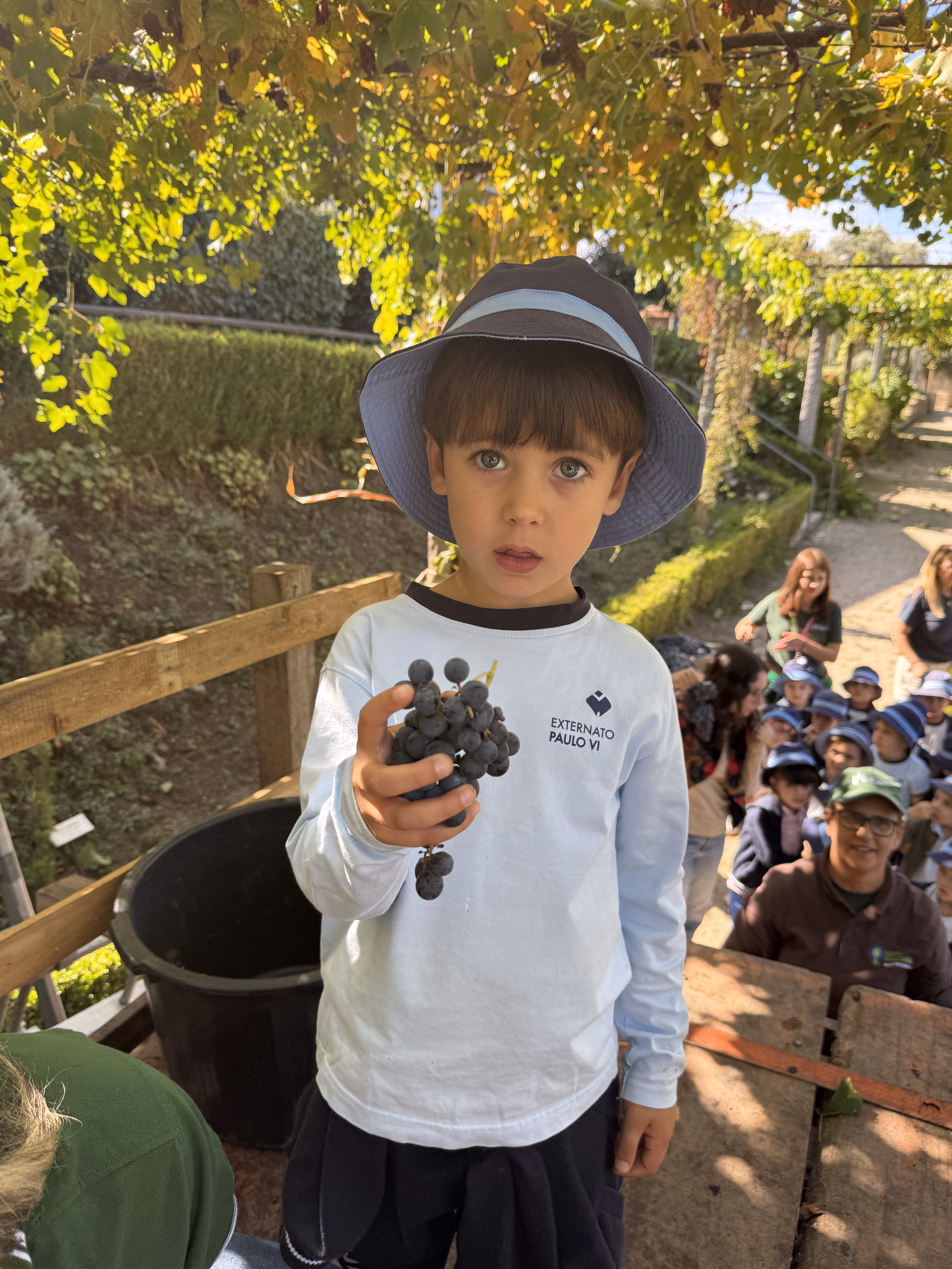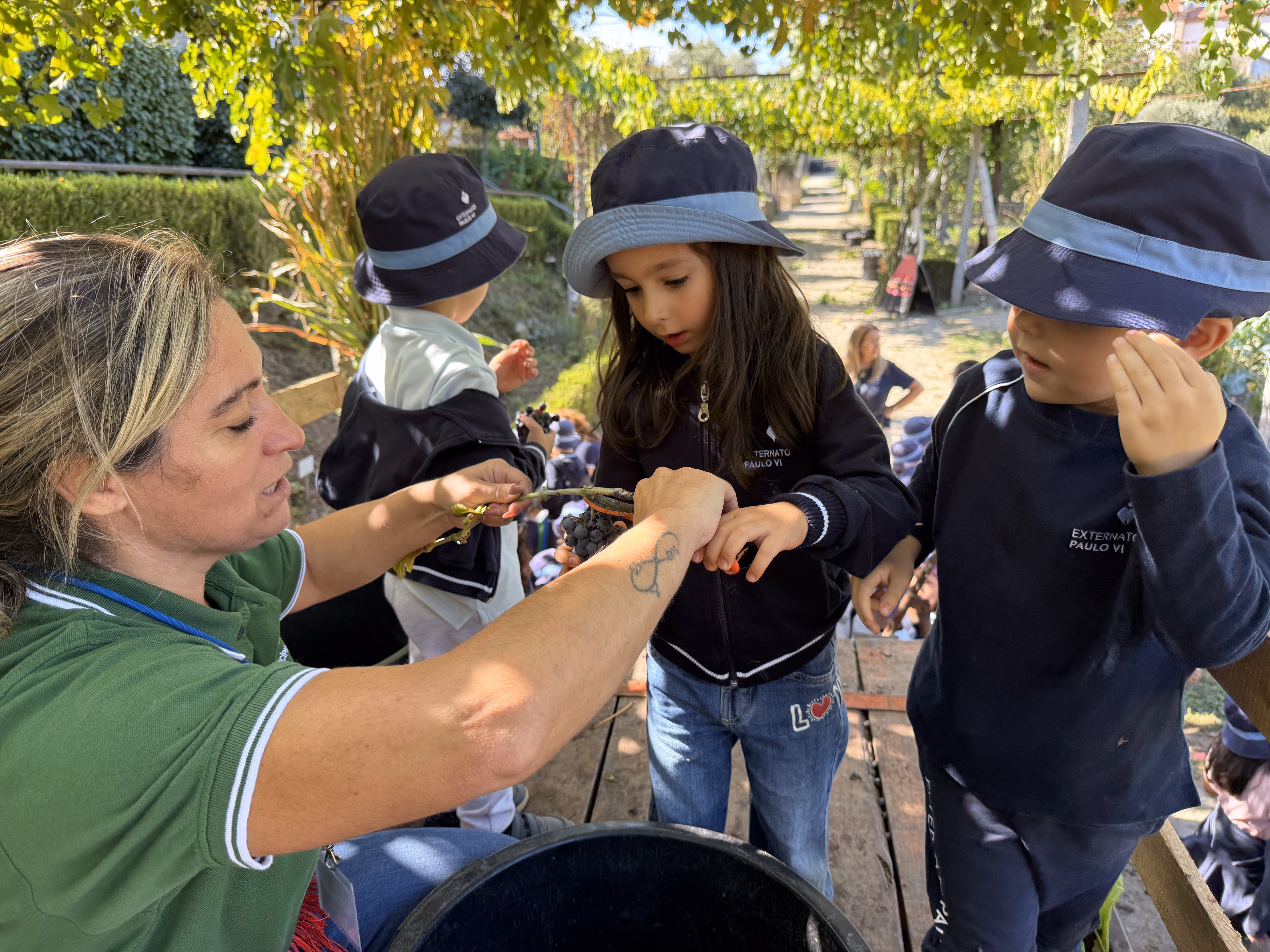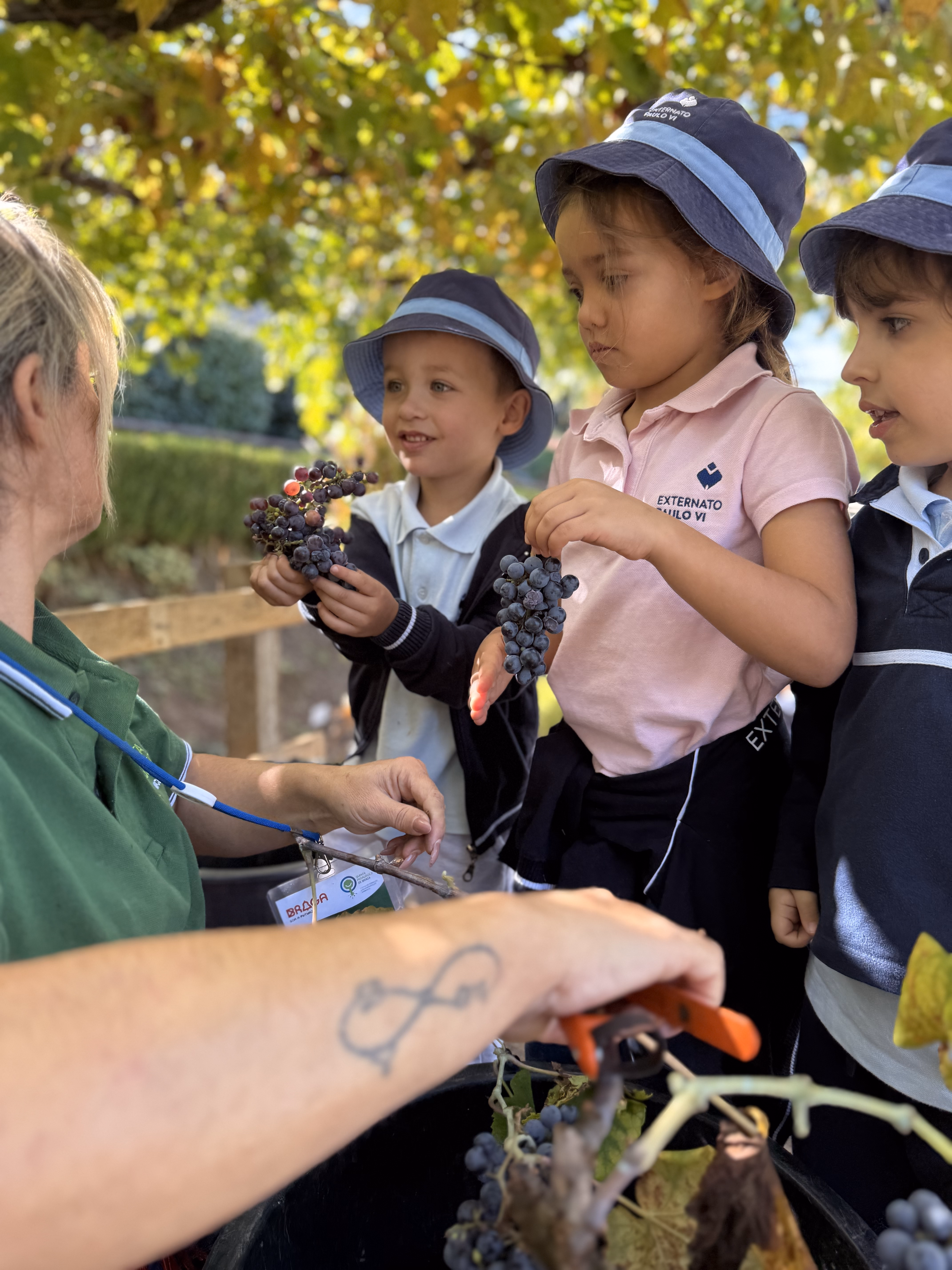 As crianças participaram também na vindima, atividade que marca a colheita das uvas no Minho. Descobriram como, em tempos, familiares e amigos se juntavam para colher os cachos, transportar as uvas em baldes e pisá-las no lagar, processo que dá início à fermentação e transformação em vinho. Esta prática era sempre acompanhada de entreajuda, celebração e convívio intergeracional.
