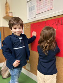 Já na Sala das Girafas B, a psicóloga Ilda Fernandes, mãe do aluno Rodrigo Coutada, dinamizou uma sessão dedicada aos afetos a partir da obra “Alguns Afetos Moram Dentro de Nós”. Houve espaço para uma breve explicação adaptada à idade e para uma atividade de mímica coletiva, em que o corpo serviu de linguagem para expressar sentimentos. No final, cada criança escreveu o seu nome e colocou-o num grande coração afixado na sala; um gesto simples que reforça identidade e pertença.